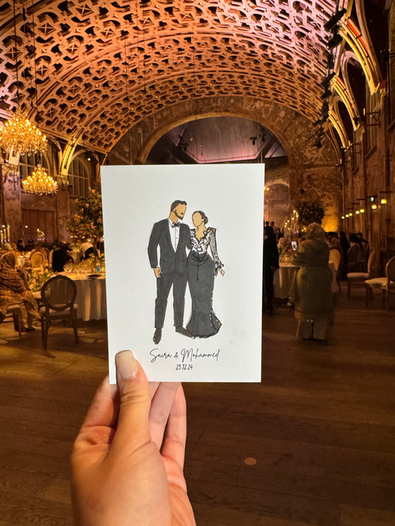 I create live, hand-drawn guest illustrations for weddings and events, offering a relaxed, seamless experience that fits naturally into the day. Each illustration is drawn on the spot and finished with personal details, giving guests a keepsake they can take home and treasure.